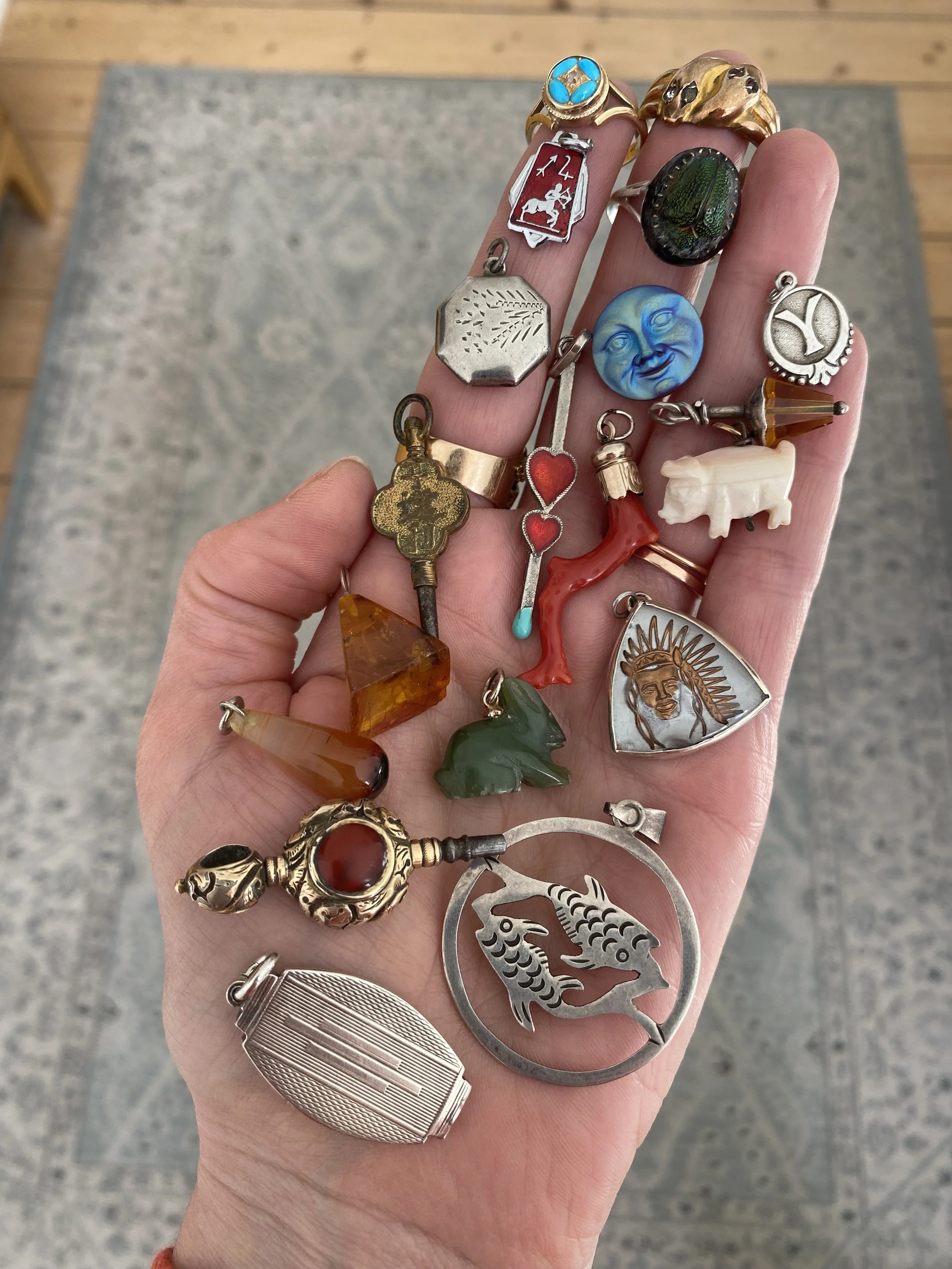 Charms are perhaps the most personal category within antique jewelry. Each one carries its own meaning, and together they form a kind of wearable narrative.