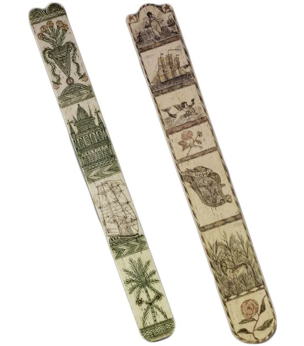 Using materials such as whale bones or teeth, pieces of wood and scraps of bone found on ships. They produced finely engraved objects, sometimes known as scrimshaw.